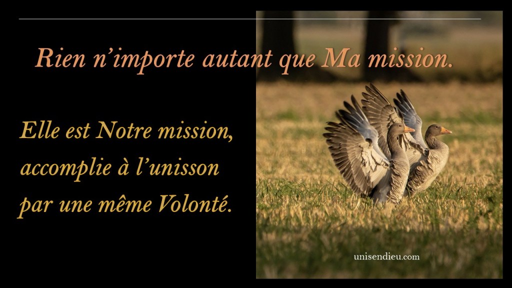 Grâce à cette réflexion, j’ai pu retourner à Dieu et abandonner l’illusion de séparation personnifiée par mon fiancé et son exil. Je l’ai vu et reconnu avant de la porter au Saint-Esprit. En retournant à ma certitude que la vie de tous les soi est entre les Mains du Saint-Esprit, je me remémore que mon fiancé est entre Ses Mains et que ceci est Sa Volonté. Il ne me reste plus qu’à accepter avec Amour Son Plan au lieu d’y résister. Nos volontés sont réunies en Une seule autour d’une unique mission qui est le retour au Foyer.